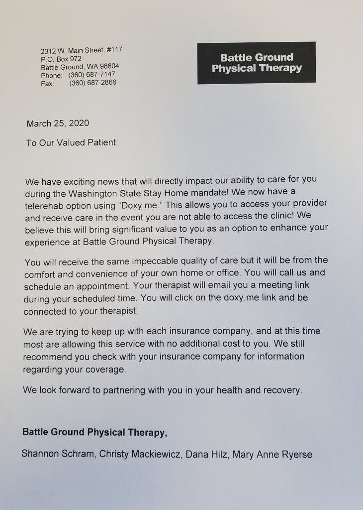 Good morning from all of us at BGPT: As physical therapy is considered an essential service in healthcare, our doors are still open! Thank you for your continued patience during this time. We love being a part of this wonderful community!We have exciting news that will directly impact our ability to care for you during the Washington State Stay Home mandate! We now have a telerehab option for physical therapy. This allows you to access your provider and receive care in the event you are not able to access the clinic!